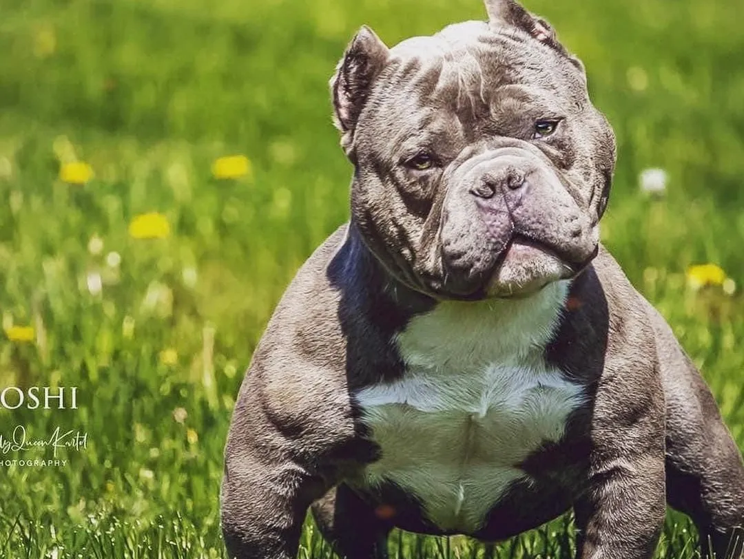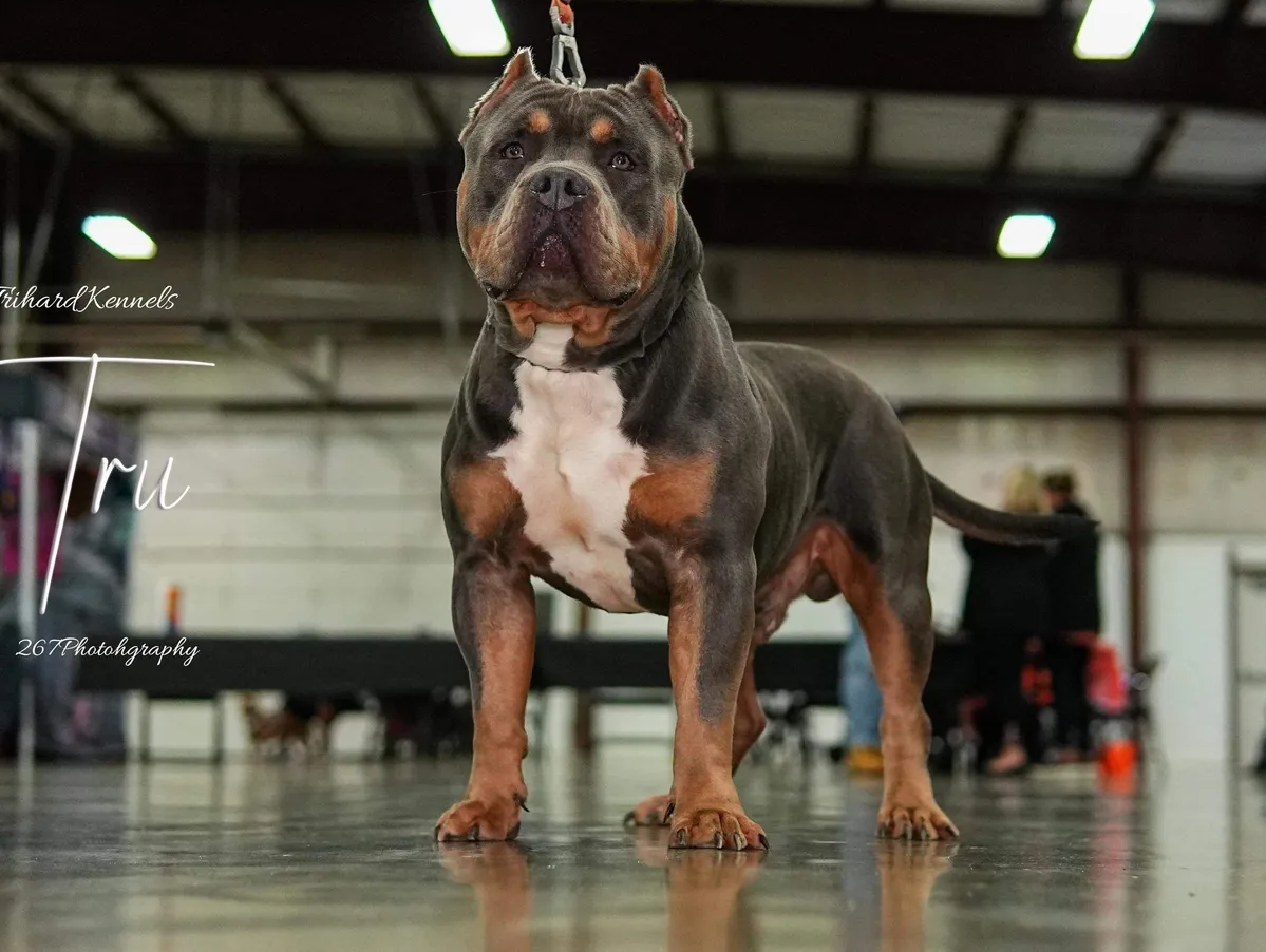 Presenting our impressive 3-year-old standard American Bully, available for stud services. This magnificent dog, UKC registered and weighing in at a solid 100 pounds, showcases a striking blue tricolor coat. His pedigree is deeply rooted in the renowned Razors Edge bloodline, ensuring superior genetics and remarkable lineage.